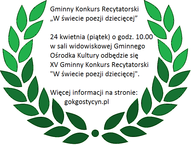 Gminny Konkurs Recytatorski „W świecie poezji dziecięcej”24 kwietnia (piątek) o godz. 10.00 w sali widowiskowej Gminnego Ośrodka Kultury w Gostycynie odbędzie się XV Gminny Konkurs Recytatorski „W świecie poezji dziecięcej”.