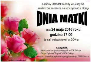 Dzień Matki w Cekcynie Date: 11 maja, 2016 in: Cekcyn Leave a comment 1038 Views Gminny Ośrodek Kultury w Cekcynie organizuje uroczystość z okazji Dnia Matki. Impreza odbędzie się 24 maja (wtorek) o godz. 17.00. Więcej informacji na plakacie.
