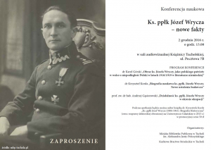 Konferencja naukowa „Ks. ppłk Józef Wrycza – nowe fakty” w Książnicy Tucholskiej Date: 24 listopada, 2016 in: Tuchola Leave a comment 35 Views W przyszłym tygodniu, tj. 2 grudnia (piątek), w Książnicy Tucholskiej, odbędzie się konferencja naukowa pn. „Ks. ppłk Józef Wrycza – nowe fakty”. Spotkanie zaplanowano na godz. 13.00.