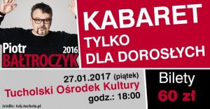 Piotr Bałtroczyk wystąpi w Tucholskim Ośrodku Kultury Date: 16 listopada, 2016 in: Tuchola Leave a comment 24 Views Piotr Bałtroczyk, jeden z najpopularniejszych polskich satyryków, wystąpi w Tucholskim Ośrodku Kultury 27 stycznia (piątek), o godz. 18.00. Cena biletu: 60 zł.